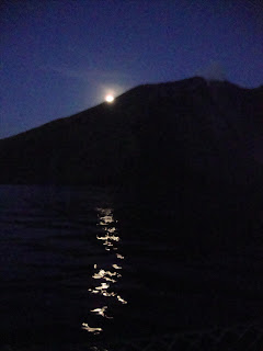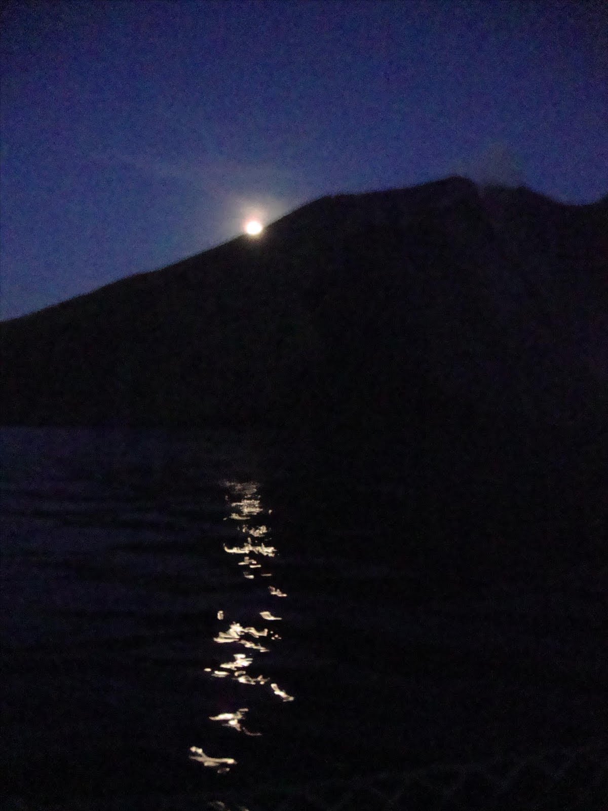 Mardi 14, fin d'apres-midi, nous entamons la traversee (une quinzaine de milles, soit deux bonnes heures de navigation) vers le Stromboli, qui fume a l'horizon. L'approche au lever de la lune est sublime, nous faisons des ronds dans l'eau au pied de la face nord pendant que la nuit tombe, et savourons le spectacle: au sommet, le cratere crache du feu et la lave, en s'ecoulant, provoque des eboulis qui finissent dans la mer en fumant. Quelle majeste!