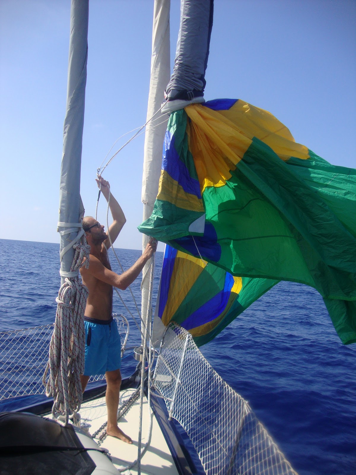 Peu après cette émouvante reconstitution vivante du Vieil Homme et la Mer, nous entrons dans la grande et belle baie dans laquelle la bouée A2, réservée à l'avance comme l'administration du parc l'exige, nous attend. L'accrochage à ladite A2 se fait sans difficulté, et l'endroit est magnifique. Marc, jamais à court d'idées aventureuses, plonge pour aller parfaire, in situ, le mouillage; en d'autres termes, il double les amarres et noue fermement tout ce qui peut l'être. Malheureusement, la tramontane qui entre dans la baie fait gigoter tout ce qui flotte...et notamment A2, la traître, qui en a profité pour attaquer le capitaine dans une prise arrière sub-aquatique défiant les règles du kung-fu... Le voilà donc dans l'eau, le sang s'échappant de son crâne. Je crains l'accident grave, évidemment, et la panique se diffuse entre Amélie et moi. La frayeur, fort heureusement, fut passagère: la coupure était nette et superficielle, trois coups de ciseaux et beaucoup de désinfectant ont fait efficacement l'affaire.