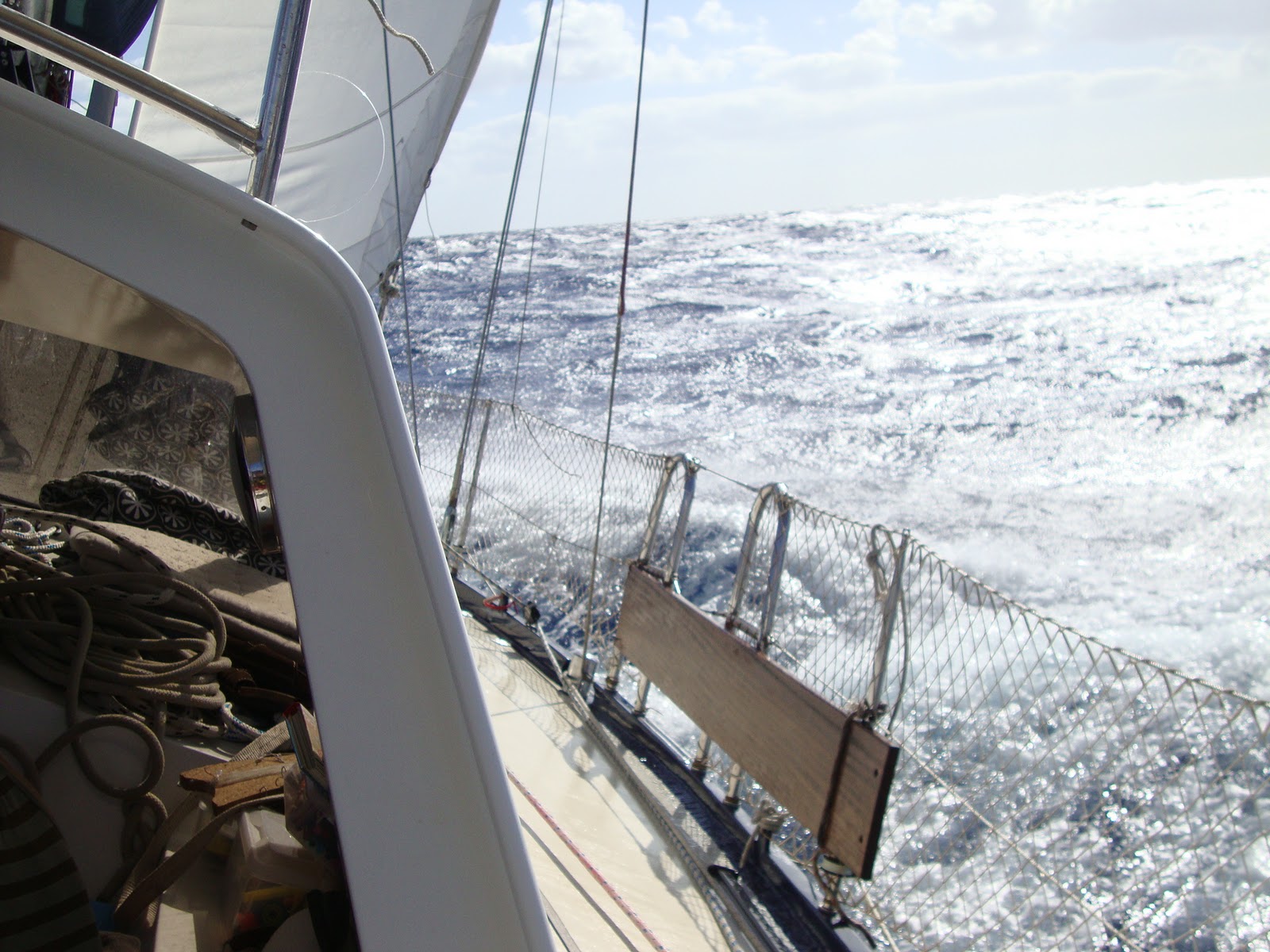 Et voilà - 5 jours et 4 nuits au large, 650 milles parcourus: pour Marc, une distance à peu près équivalente à ce qu'il avait effectué entre Brest et Lisbonne l'année dernière; pour Ian, moitié moins de ce qu'il a fait de plus long lors de son voyage entre Bali et Alicante; pour les enfants et moi, une expérience tout à fait nouvelle, à la fois un aventure enrichissante et un défi. Une autre façon d'envisager le temps qui passe, parfois effroyablement lentement, une manière d'apprendre à se défaire -laborieusement- de nos repères connus. Mais aussi une extraordinaire expérience d'autonomie absolue et de quiétude (sous les étoiles, ou devant l'horizon baigné de soleil), la possibilité d'une belle rencontre avec Ian, dont la présence à bord n'a été que bénéfique, et l'occasion de découvrir, en chacun de nous, des ressources jusque là inconnues...
