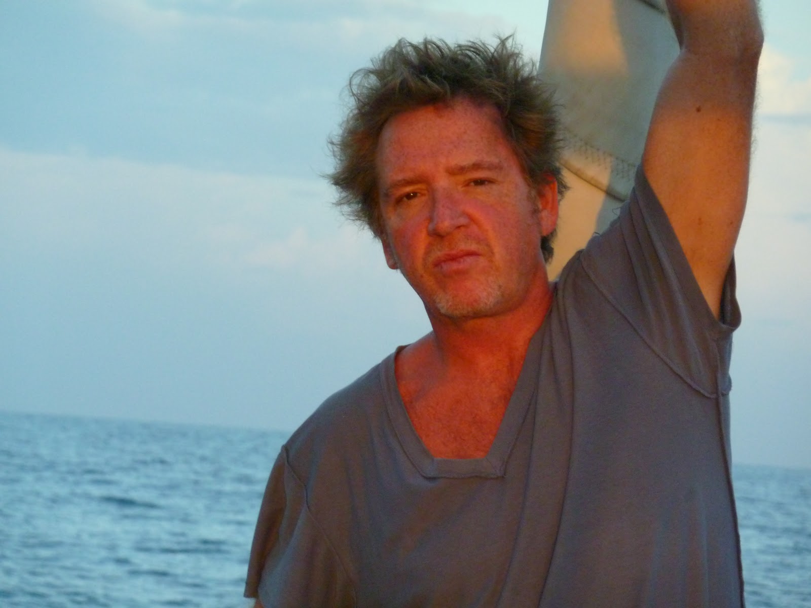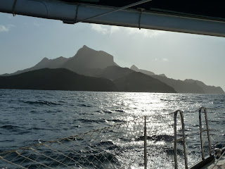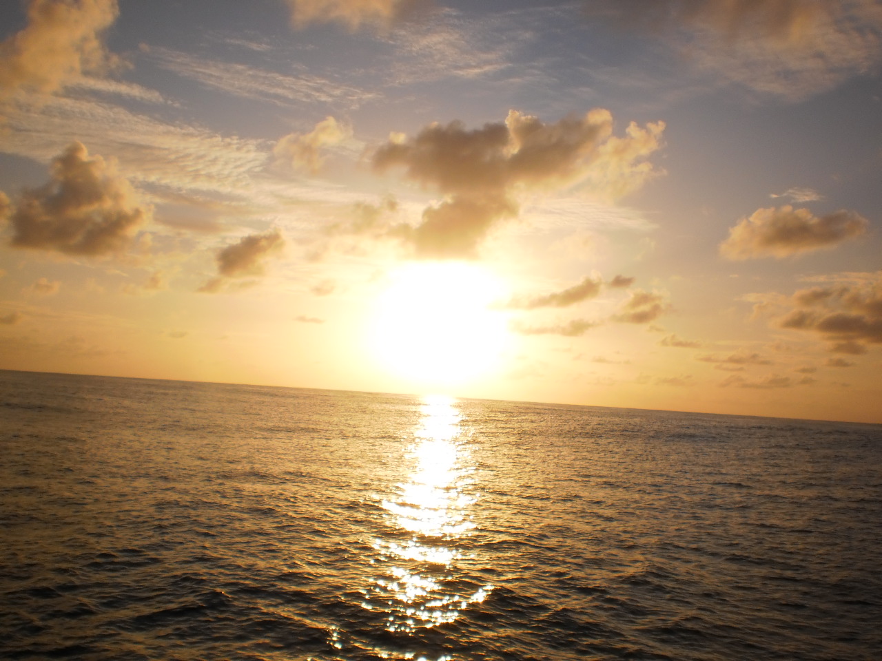 19h, les rayons du soleil pénètrent en oblique dans l'océan, c'est l'heure de la pêche: nous attrapons un beau gros poisson - qui meurt de frayeur (crise cardiaque !?) tandis que Marc mouline pour le ramener à bord. Nos lectures dans la littérature spécialisée nous permettent rapidement de l'identifier comme étant une bonite à ventre rayé: relativement rare et, d'après le pictogramme "2 fourchettes", très apprécié pour sa chair tendre...