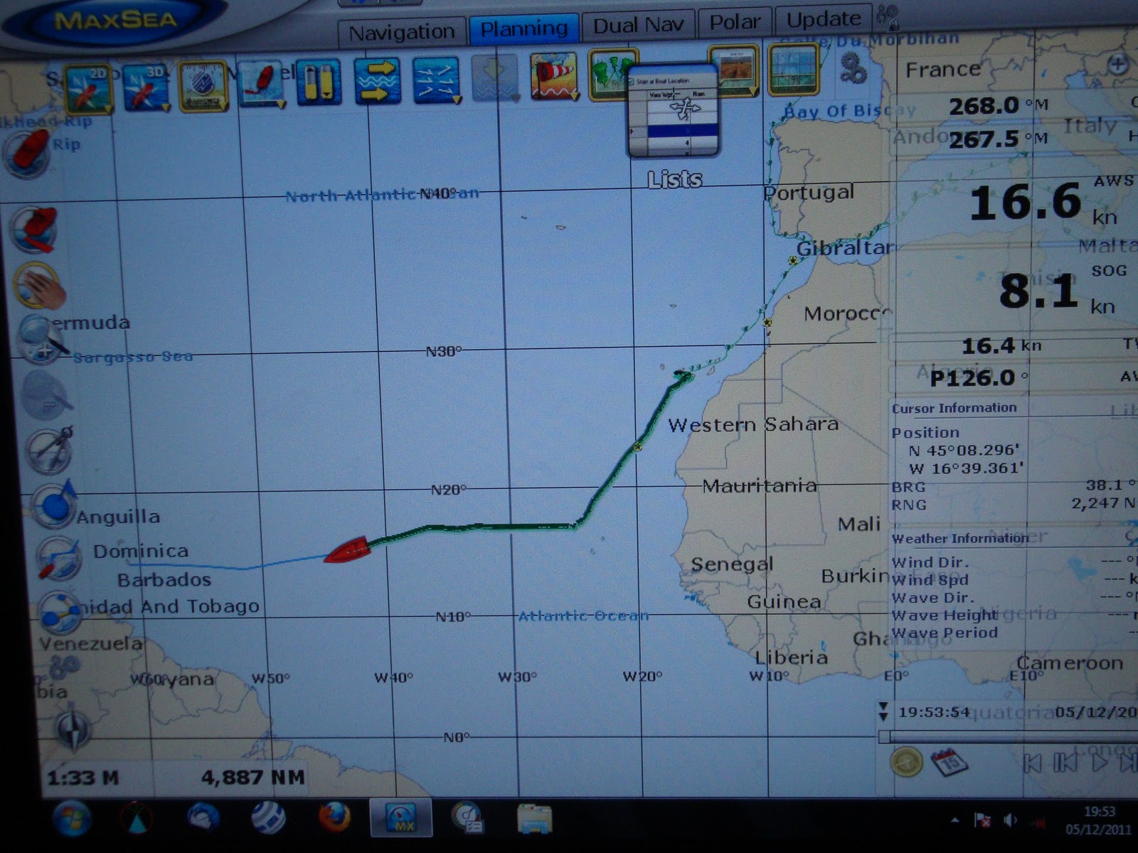 3h, du vent, enfin! 12 noeuds bien orientés, nous filons à belle allure (7,8 noeuds) après avoir empanné pour retrouver un cap qui devrait nous amener en ligne droite sur Lanzarote.