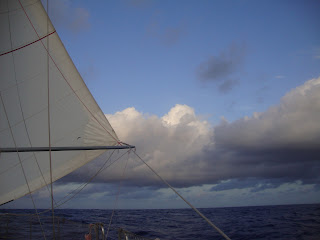22h, le vent va et vient. Nous baissons le spi, et avançons sous grand voile et gênois avec un cap un peu plus à l'ouest pour passer en vent trois quart arrière et réduire le roulis. Nous maintenons vaille que vaille une moyenne de 5,5 noeuds.