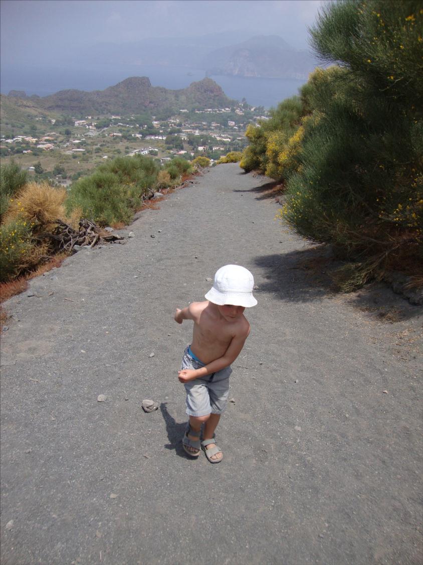 VULCANO, d'abord: a l'ancre dans la baie tranquille de Porto di Ponente, nous sommes presque reveilles par l'exquise odeur de souffre qui nous chatouille les narines. Soyons clairs, cela sent l'oeuf pourri... Mais la presence du volcan tout proche et les petits geysers sous-marins qui font jaillir des bulles a la surface de l'eau autour du bateau offrent un spectacle etonnant! Nous sautons dans Bouee (c'est le nom donne a notre dinghy par les enfants) et partons en expedition sur la plage de sable noir (poussiere de lave...waouw). Elle est jonchee de meduses? Qu'a cela ne tienne: Luca et Vadim se lancent avec entrain dans une mission "kip-kap" avec des batons (le plus pointus possibles, bien entendu) glanes dans les environs - c'est beurk, mais qu'est-ce qu'on s'amuse! Depuis le village de Vulcano, au bord de l'eau, nous partons a pied jusqu'au sommet du volcan (environ 400m d'altitude). A noter: Luca, qui a marche tout le long sans protester, pendant que son petit frere se tenait tranquillement perche sur les epaules de Papa, est vote heros-du-jour...