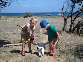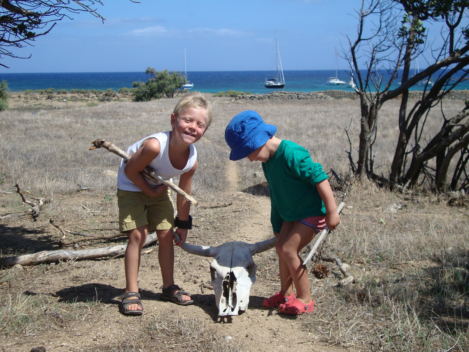 Nous ne nous attardons pas le lendemain matin et (apres que Marc ait plonge dans les eaux pour le moins suspectes du port pour constater les degats du choc d'hier sur la quille), filons vers l'isola Asinara, etonnant endroit a l'allure de bout-du-monde abritant semble-t-il une ancienne prison et peuplee quasi exclusivement d'anes et de chevres. Nous passerons la deux jours a attendre que passe le gros coup de mistral, a ramasser des cranes de chevres et a cogiter sur le meilleur moment pour entreprendre la traversee vers Minorque.